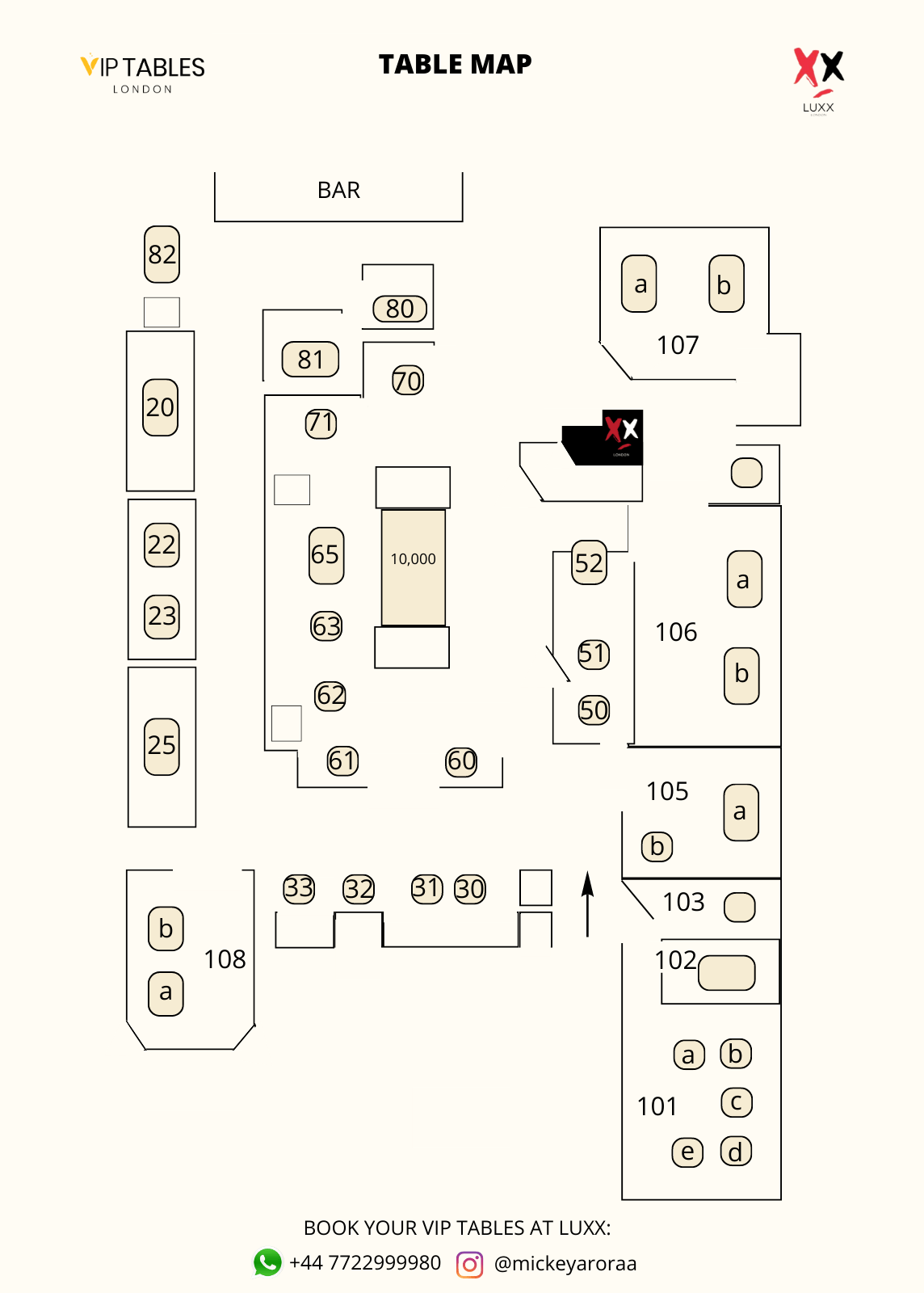 – The VIP Table: Elevate your experience with a VIP table, available at £2000 minimum spend for groups of up to 3 guests and £3000 minimum spend for groups of up to 10.
